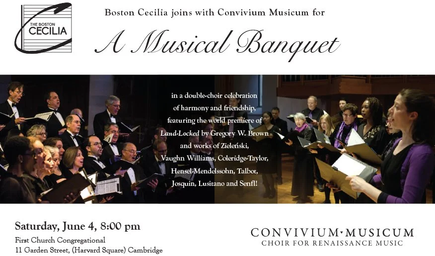 The Boston Cecilia joins forces with Convivium Musicum (Latin for "musical banquet") in a wide-ranging program of ancient and modern a cappella music for forces large and small. Our concert will feature Land-Locked, a world-premiere piece for double chorus, composed especially for Cecilia and Convivium, by Gregory W. Brown, alongside polychoral works by Joby Talbot and Mikołaj Zieleński. In addition, each ensemble will perform its own set of musical selections.
